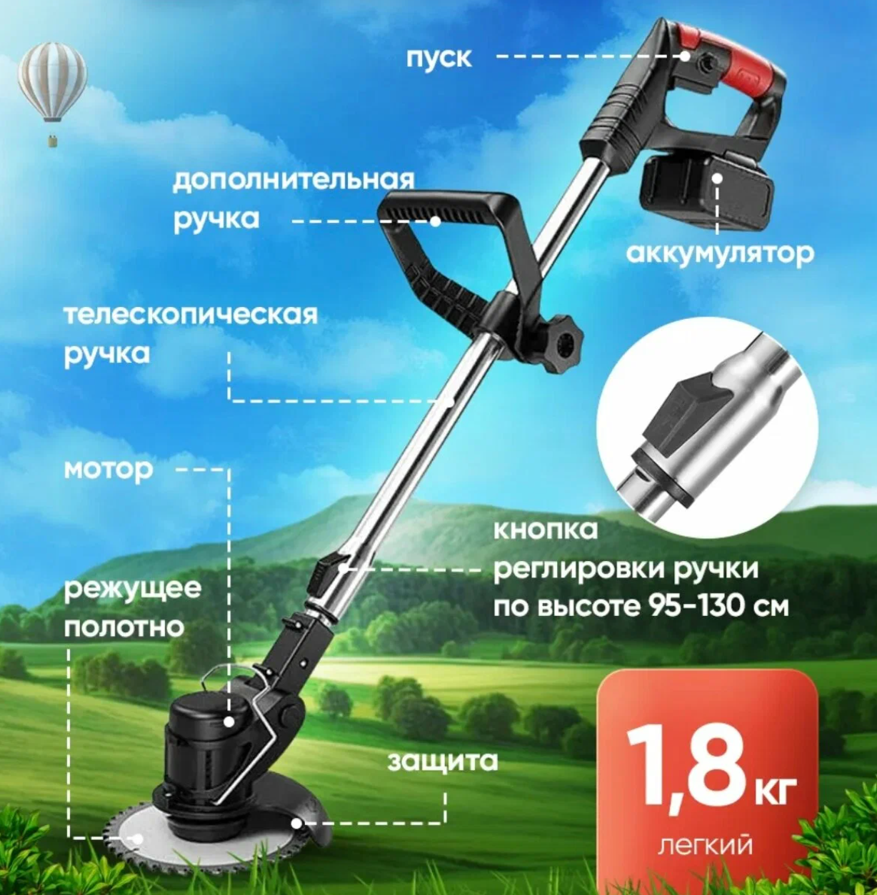 Это устройство имеет широкий спектр применения и подходит для стрижки небольших кустарников, парков, дач, тротуаров, террас и многого другого.